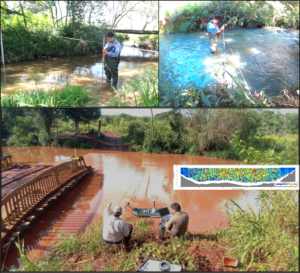 - Mediciones de Caudal: realizamos servicios de medición de caudal en puntos de interés definidos por nuestros clientes a intervalos regulares o, preferentemente, según previsiones meteorológicas. Realizar campañas de medición de caudal según la previsión meteorológica resulta más efectivo cuando el interés es construir una curva altura-caudal, aunque esto no siempre es posible, el esfuerzo es gratificante, sobre todo en cuencas de pequeño porte, donde los hidrogramas transcurren en pocas horas y las distancias a recorrer para acceder a los puntos de interés son largas. Los equipos utilizados para la medición de caudal son cuidadosamente seleccionados según las características específicas del punto de aforo. Contamos con equipos mecánicos (molinete hidrométrico) y Perfiladores de Corriente Acústicos por efecto Doppler (ADCP) por sus siglas en ingles.